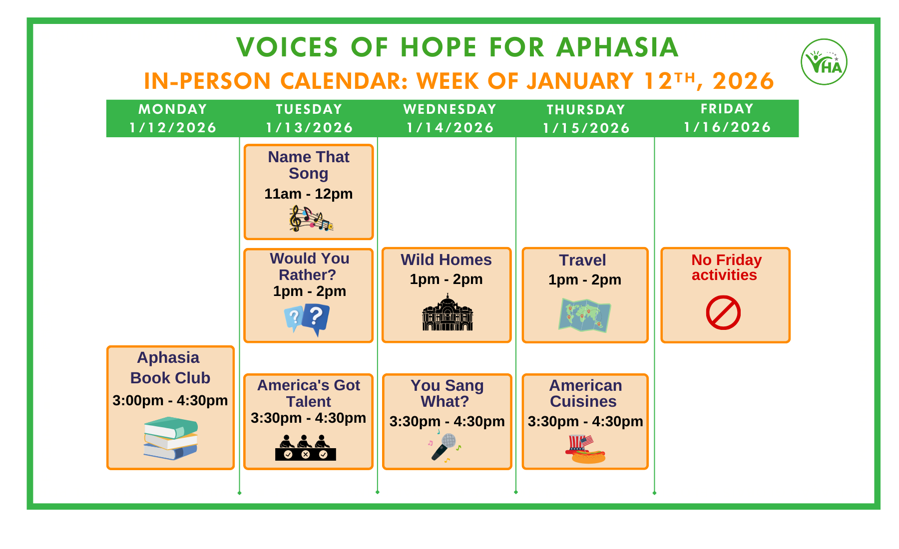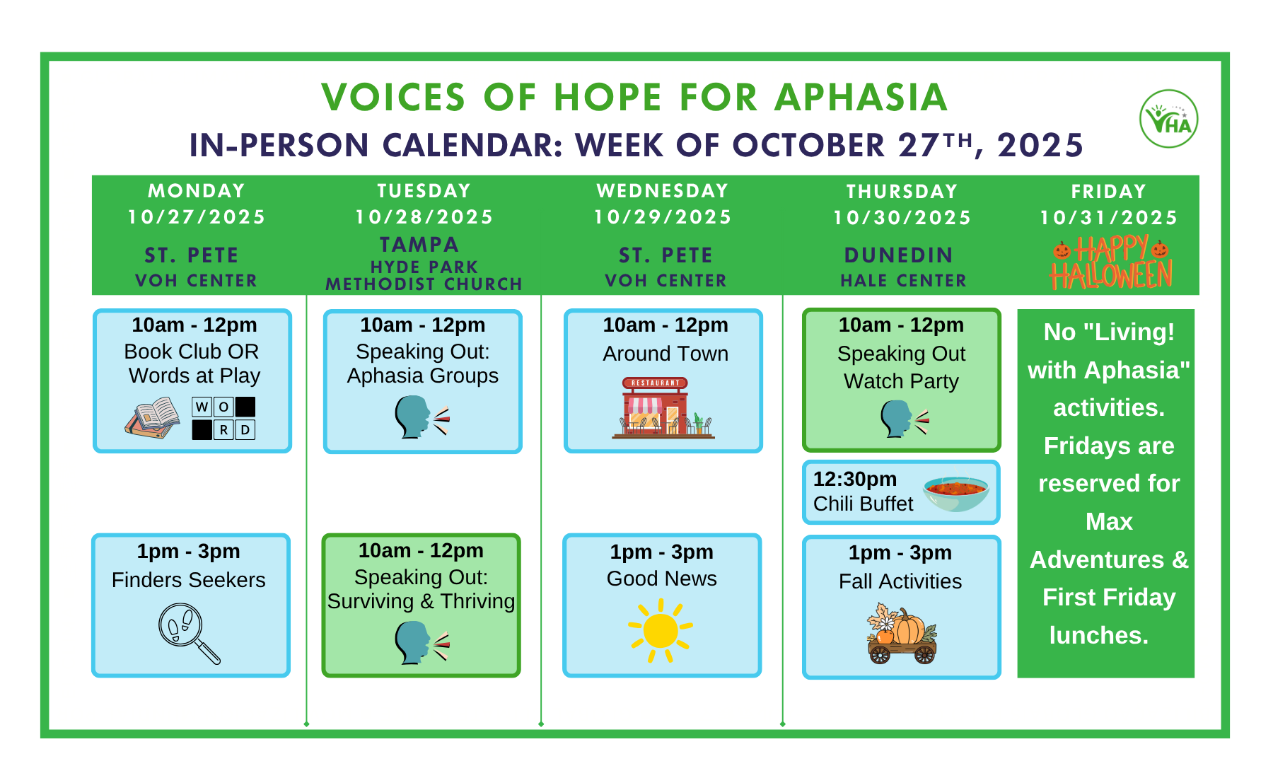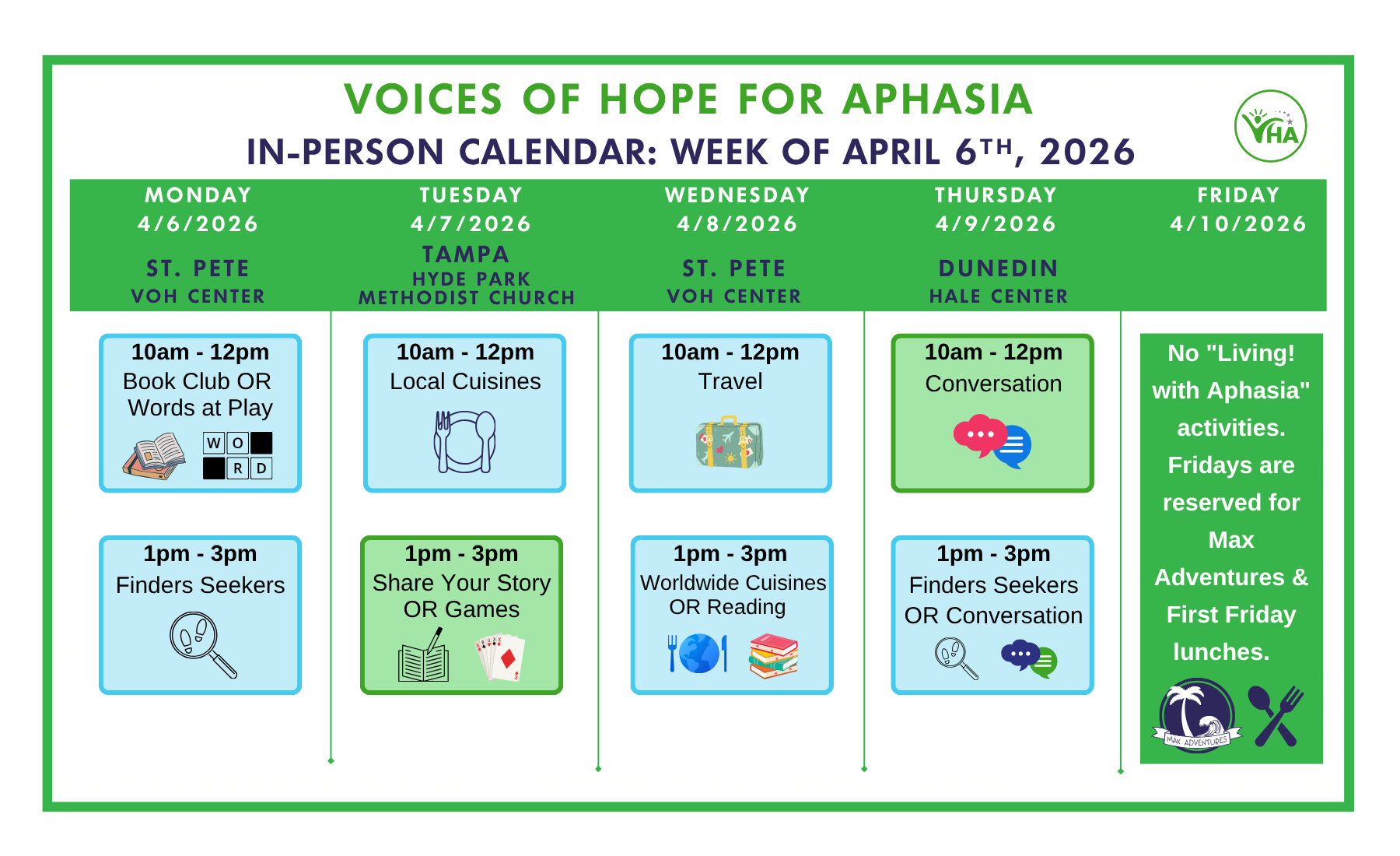 In-person activities are held Monday through Thursday. Please note the times and locations on the calendar below. If you are interesting in joining us for an in-person session, please contact us.