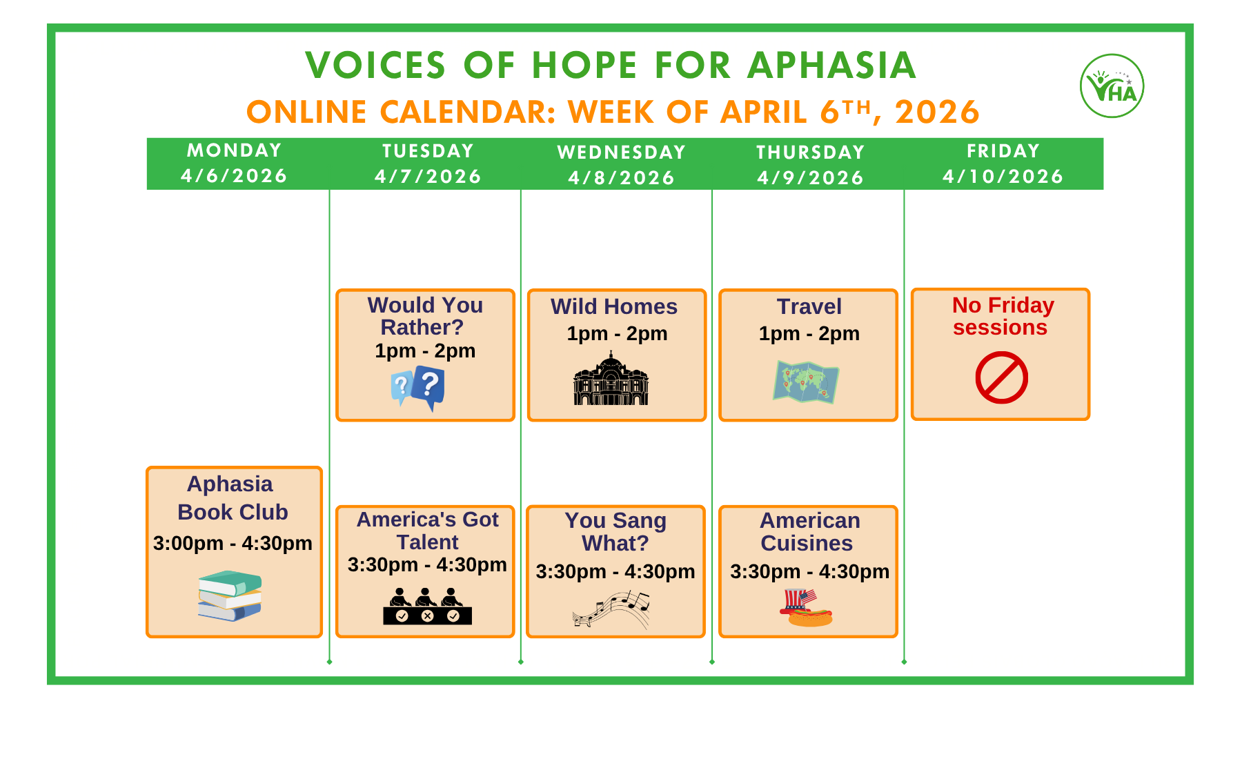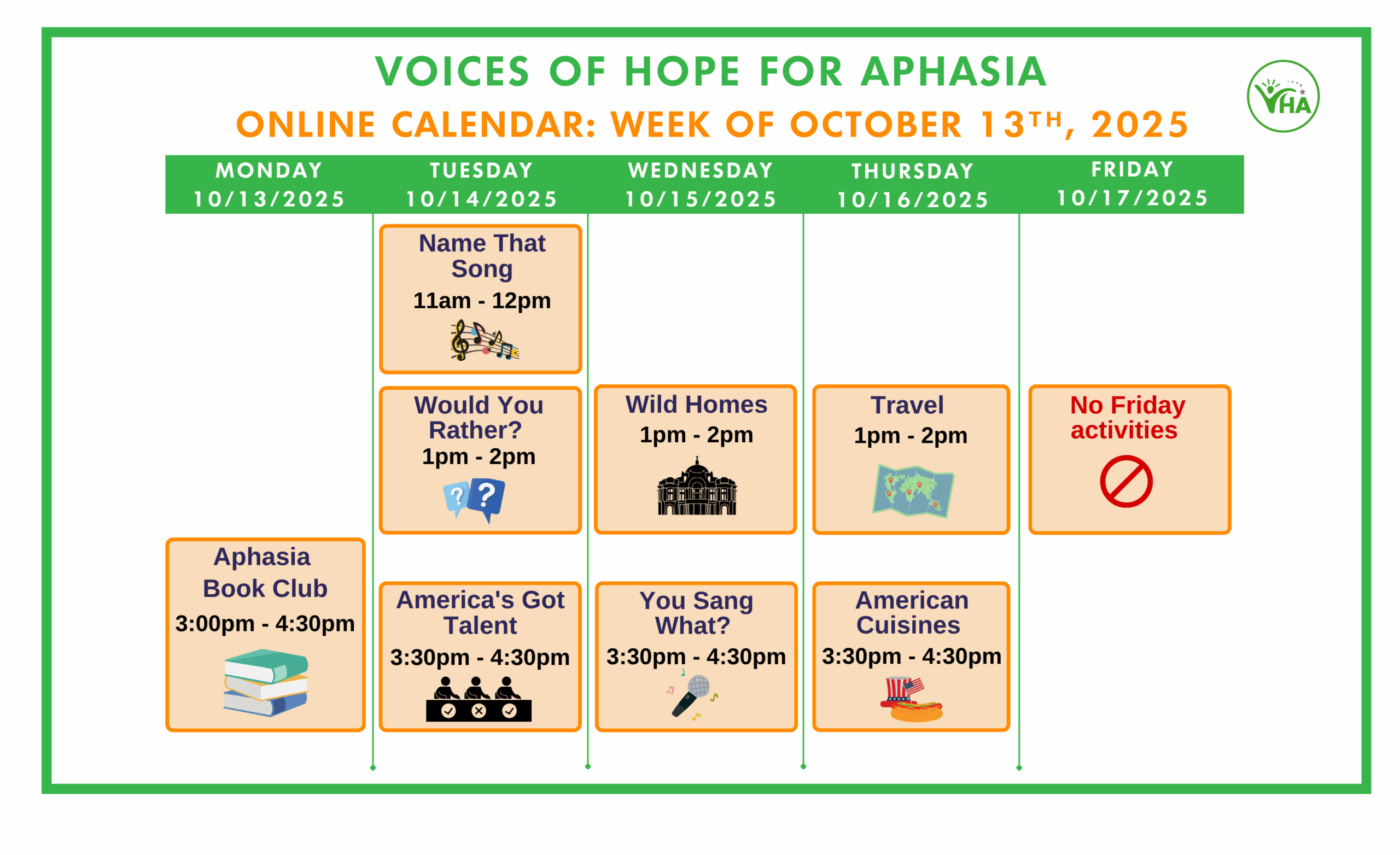 NEW MEMBER?? If this is your first time joining Voices of Hope for Aphasia, contact us or follow the instructions here. A short intake meeting is required prior to attending any sessions. We look forward to meeting you!