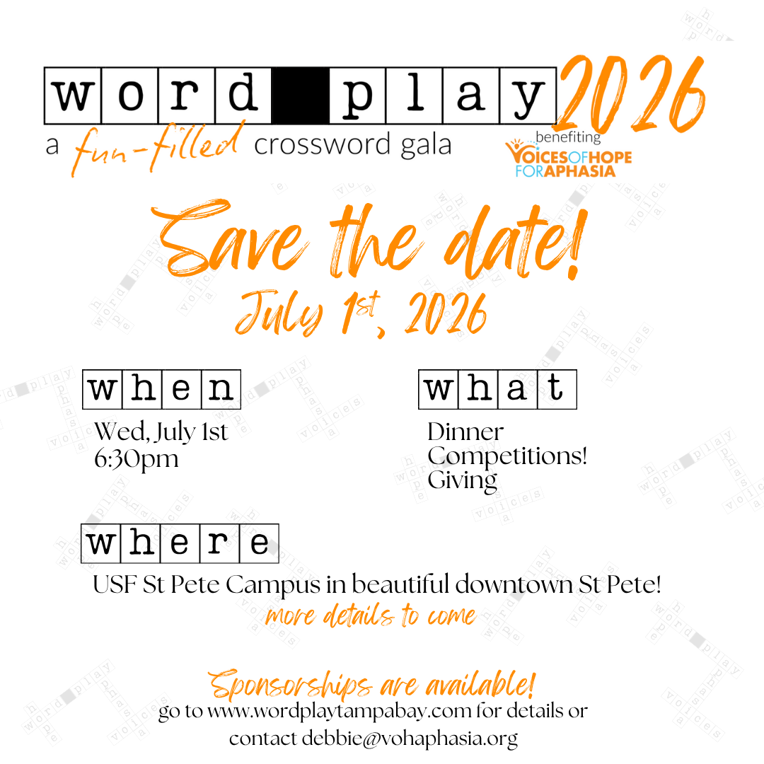 On Wednesday, July 1st, 2026, Voices of Hope for Aphasia will host it’s fourth annual Word Play event sponsored by the University of South Florida, Department of Communication Sciences and Disorders. Word Play is a fun-filled night of word-game competitions, dinner, and opportunities to support Voices of Hope for Aphasia, with a special tribute to Tampa Bay’s own puzzle master, the late Merl Reagle, the nationally known and syndicated crossword puzzle constructor.